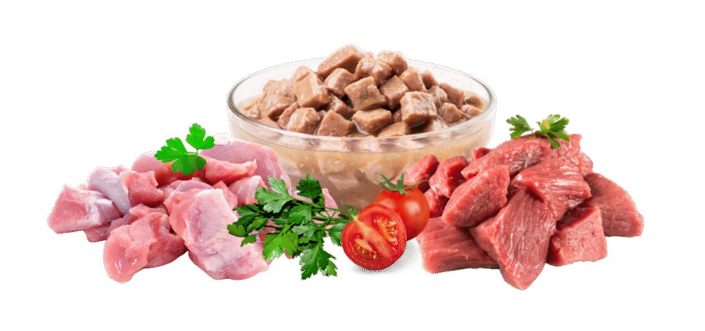 Premium wet food from TM Carpathian Pet Food "Veal & duck in sauce" with veal and duck in sauce – nutritious complete canned food for adult cats of all breeds.